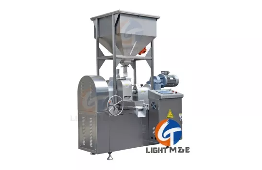 The mixed material enters a twin-screw extruder, where it is rapidly gelatinized and expanded under high temperature and pressure. It is then extruded through a die into strips, curves, or special shapes. A cutter cuts the product into the desired length.